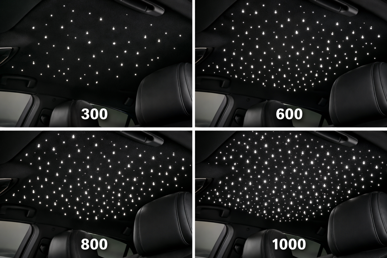 This picture shows you the different amount of stars we offer. These are the most common options. We obviously can do more up to 2000. This picture is just a diagram. All headliners will look different due to sizing.